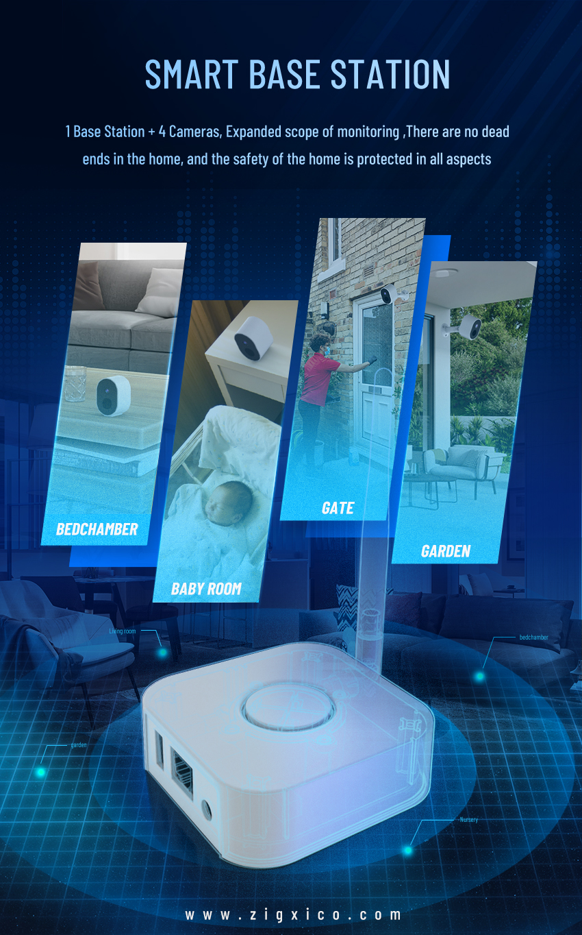 This kit including : 1home base +3 battery cameras, which solves the WI-Fi through-wall performance and close-range transmission problems of traditional devices.